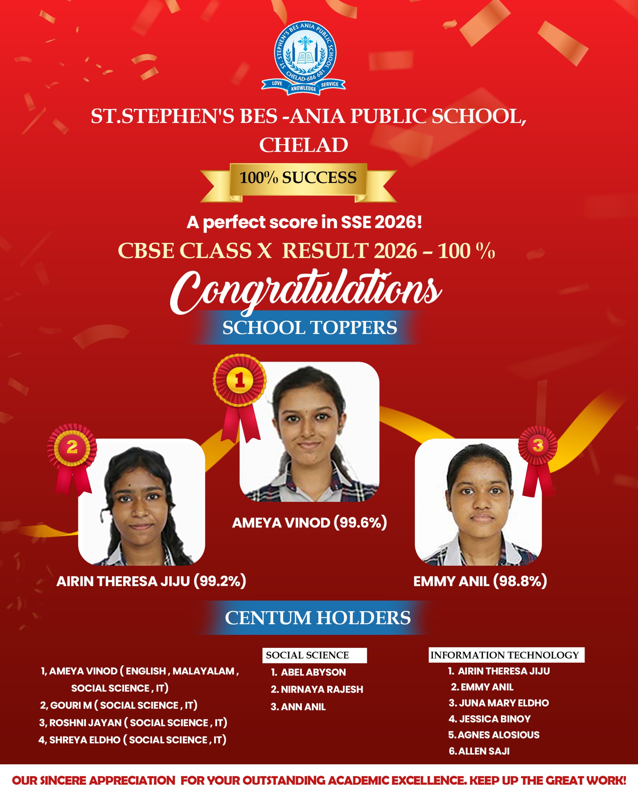 St. Stephen’s Bes Ania Public School, Chelad, Kothamangalam, a Senior Secondary School affiliated to Central Board of Secondary Education, New Delhi was founded in the year 1997.